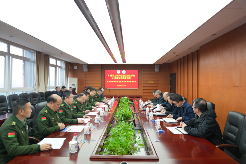 【文/图 党委保卫部】12月25日,学校与陆军工程大学通信士官学校签订军地融合协同发展战略合作协议。协议的核心在于通过资源共享、优势互补,实现军民融合发展,助推两校协同发展、高质量发展。校长陈忠飞、副校长舒鸿、陆军工程大学通信士官学校政委王洪刚、副校长蒋勇及相关科室负责人出席签约仪式。签约仪式由舒鸿主持。
