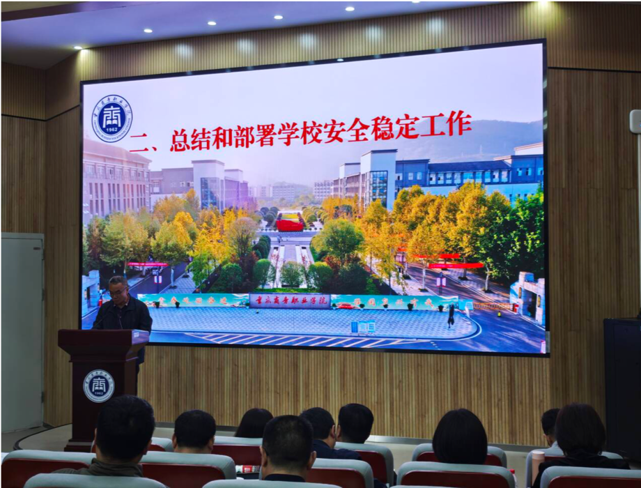 【文/图 党委保卫部】4月15日,学校安全稳定工作会议在南岸校区召开,党委书记江涛,党委副书记、校长陈忠飞以及其他校领导,各部门、二级学院党政负责人和副科级以上干部等代表出席会议。会议由副校长舒鸿主持,大学城校区设立分会场以视频方式同步召开。