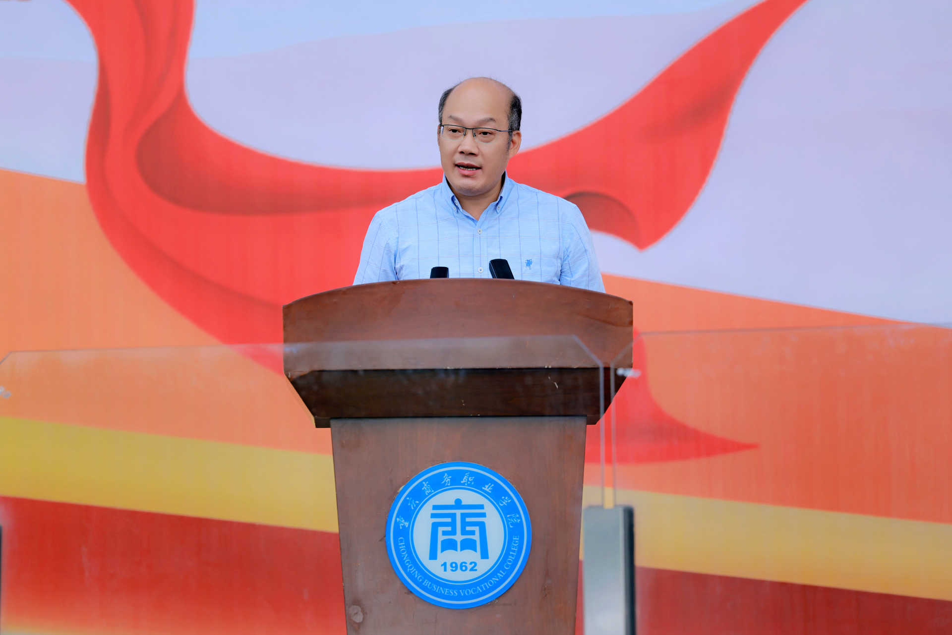 校长陈忠飞向全体新生致辞。他代表学校向全体新同学表示热烈的欢迎,向辛勤付出的全体教官和老师们致以感谢。他指出,学校办学63年来,秉承“商行天下,学润德才”的校训,持续夯实办学根基、厚植育人土壤,全力为每名学生成长成才提供全方位保障。他从师资队伍、教学实训资源、成长平台、学生技能竞赛等方面介绍了学校近几年在办学上取得的成就,并希望同学们将所学知识转化为解决实际问题能力的练兵场,让技能立身变为看得见的实践,实现从“校园人”到“社会人”的蜕变;将所学技能转化为回馈家庭养育期盼,扛起责任担当的优异成绩单,让父母和社会看得见实实在在的成长和收获;将所学知识和技能转化为服务社会发展和国家建设的入场券,把个人成长融入国家需要,成为实现中华民族伟大复兴的具体行动。他表示,学校将从强化技能适配产业、强化平台赋能就业、强化拓宽就业路径等方面为大家多元成长保驾护航。最后,他寄语新生要从军训磨砺中汲取奋斗力、顽强拼搏力、磅礴凝聚力,并将其转化为爱国之情、报国之志、学习之行,坚定信念、勤学知识、苦练本领、锤炼品格,真正成长为堪当大任的时代新人。