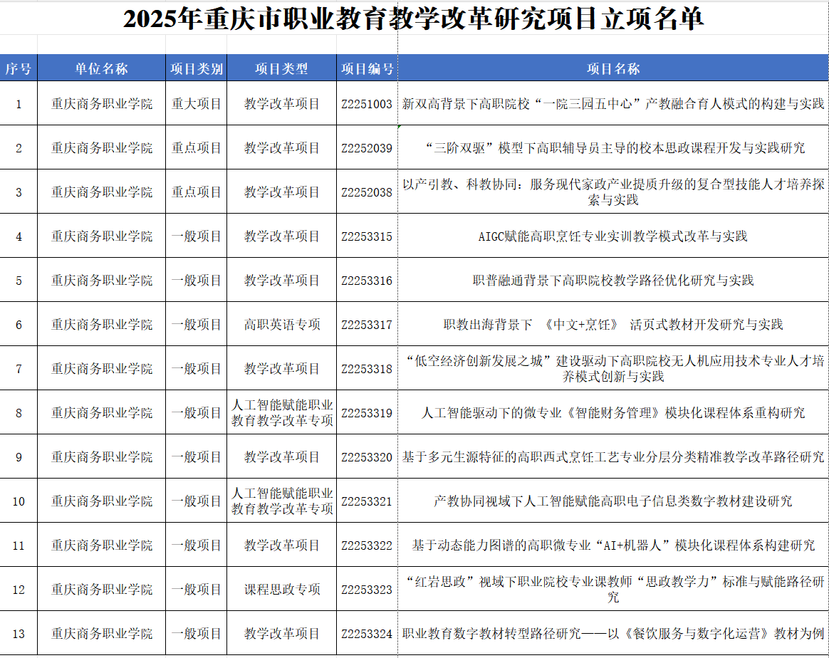 【文/图 教务处】近日,重庆市教育委员会发布了《关于公布2025年职业教育教学改革研究项目遴选结果的通知》。学校13个项目获批立项为重庆市2025年职业教育教学改革研究项目,其中《新双高背景下高职院校“一院三园五中心”产教融合育人模式的构建与实践》立项为市级资助的教学改革重大项目(全市排名第3),《“三阶双驱”模型下高职辅导员主导的校本思政课程开发与实践研究》等2项立项为市级教改重点项目,《AIGC赋能高职烹饪专业实训教学模式改革与实践》等10个项目立项为市级教改一般项目。