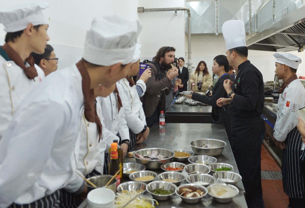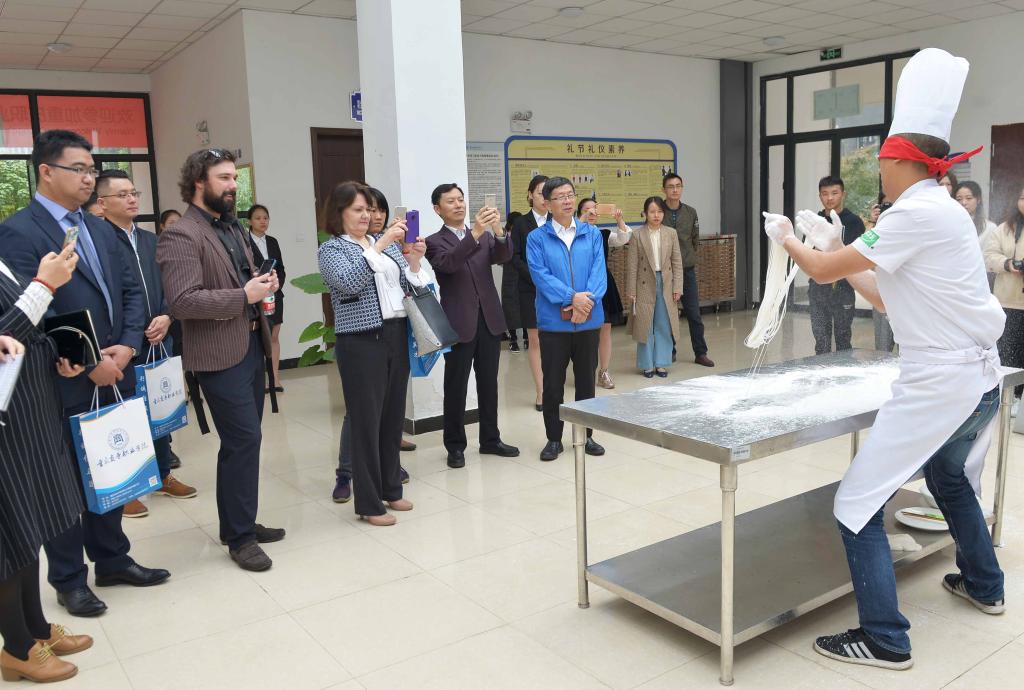 随后,考察团前往实训教学现场,观看了茶艺表演,品尝了中式甜点,他们对中国独特的烹调技艺和茶艺文化由衷赞叹。