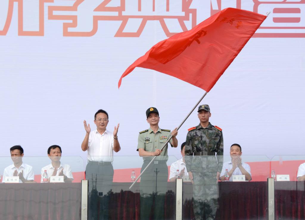 谭勇向本次军训团授旗,颜小平接过旗帜,紧握高举,旗帜在风中飘扬。
