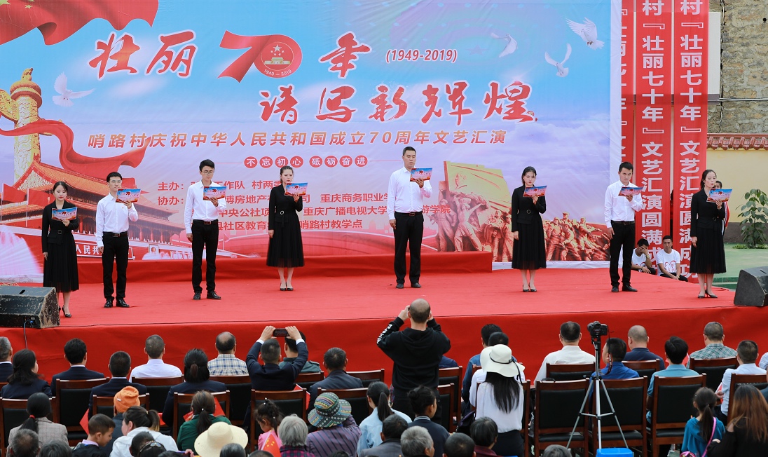 9月21日下午,巫山县曲尺乡哨路村便民服务中心国旗飘扬,歌声嘹亮。学校驻村第一书记、曲尺乡哨路村工作队长贺昌精心策划的大型文艺汇演正在进行。本次演出以“壮丽70年,谱写新辉煌”为主题,旨在庆祝中华人民共和国成立70周年,对脱贫攻坚工作进行再鼓舞再发动,号召大家坚决以习近平新时代中国特色社会主义思想为指导,取得脱贫攻坚决定性胜利。