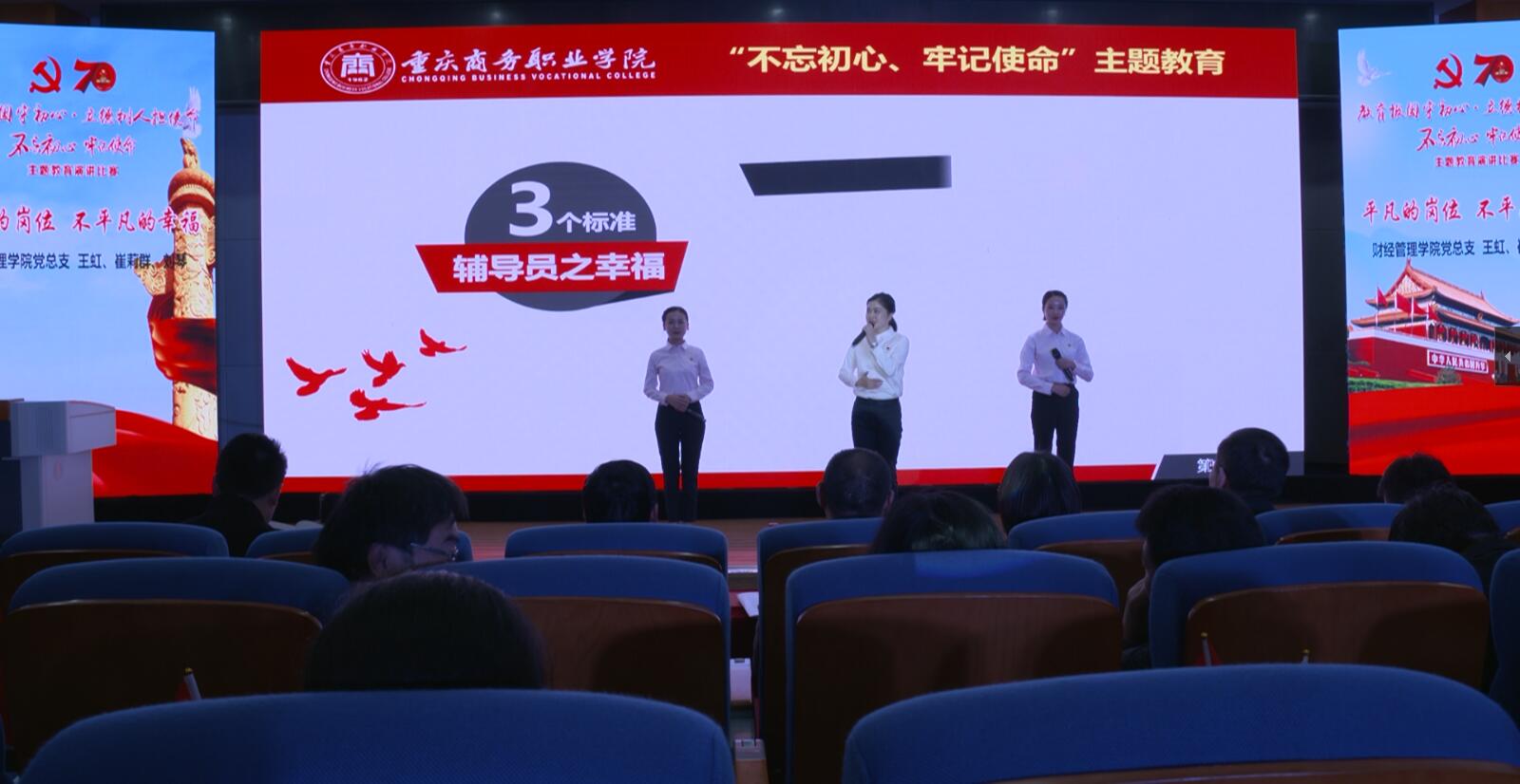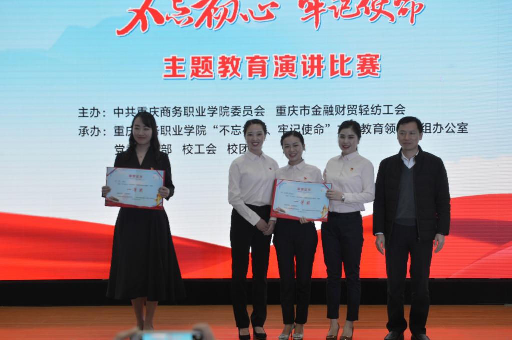 【文/主题教育领导小组办公室 图/党委宣传部】为了丰富“不忘初心、牢记使命”主题教育学习形式,营造浓厚氛围,展现党员干部紧跟时代、砥砺前行、担当有为的精神风貌,11月21日,学校“不忘初心、牢记使命”主题教育演讲比赛决赛在学术报告厅举行。比赛由中共重庆商务职业学院委员会和重庆市金融财贸轻工纺织工会联合主办,主题教育领导小组办公室、党委宣传部、校工会、校团委共同承办。演讲比赛评委来自市金融财贸轻纺工会领导以及部分高校党委宣传部、工会、团委的负责人。在家校领导和各党总支(支部)党员、青马班学员代表观看了比赛。