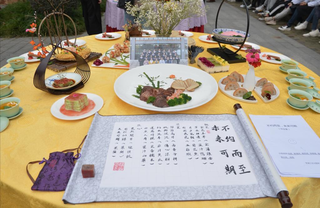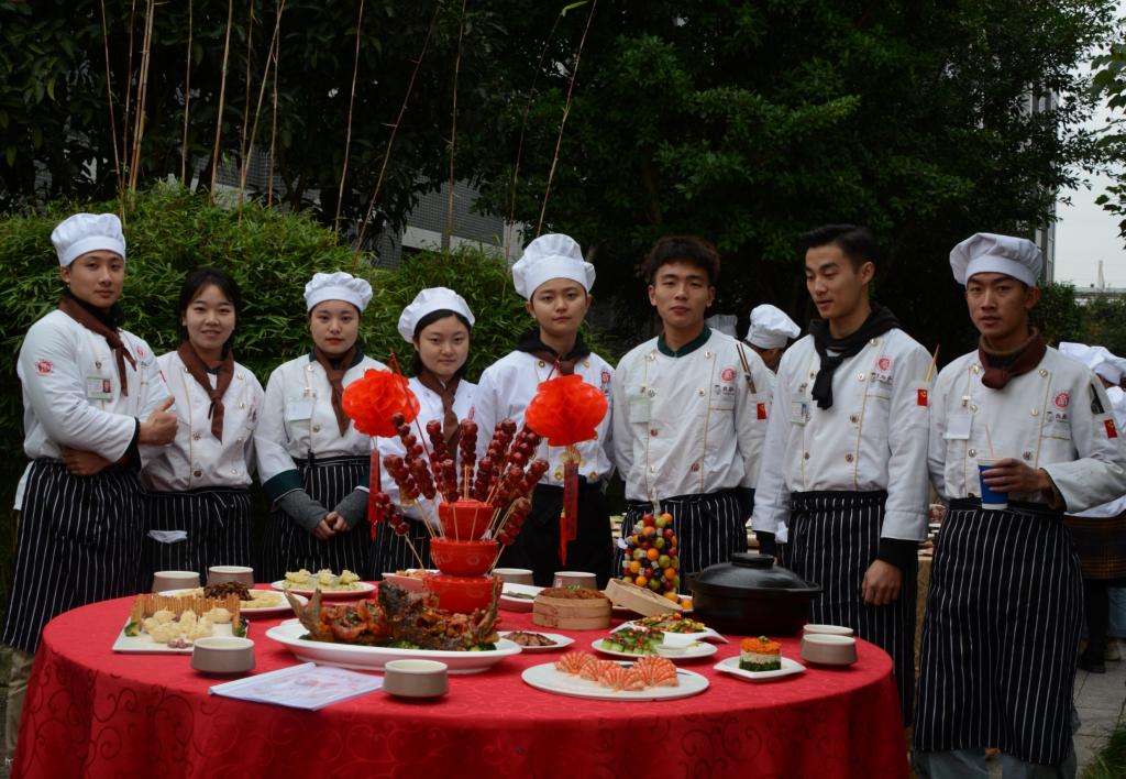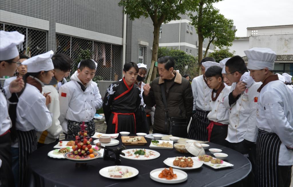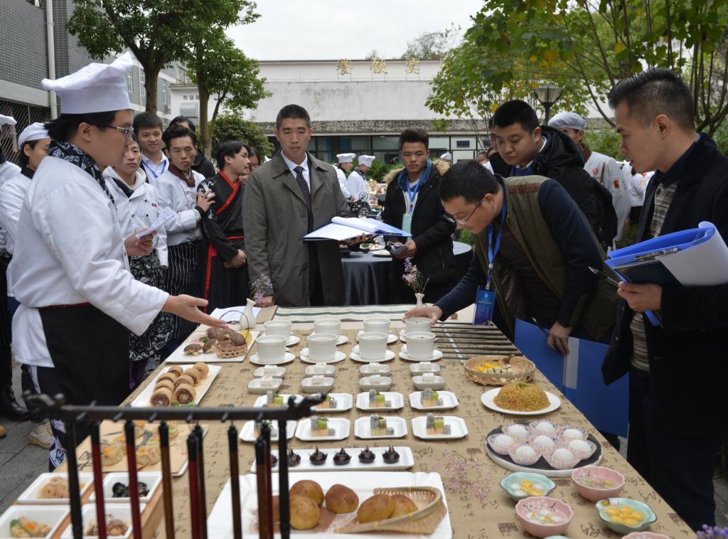 与会专家学者参观了学校餐饮旅游专业群综合实训成果展及烹调工艺与营养专业办学十年成果展。专业群共展出创意作品40余件,其中烹调工艺与营养专业的师生制作了充满重庆特色、文化创意、色香味俱全的主题菜品;旅游管理专业和景区开发与管理专业展示了自制的旅游文创产品、风景园林沙盘、旅游宣传视频及精心策划的旅游才艺项目;酒店管理专业展示了学生精心设计的中餐宴会摆台主题设计和主题客房设计作品;社区管理与服务专业展示了社区活动策划书、社区主题讲座海报及社区手工作品等。展示作品集文化底蕴挖掘和菜品菜艺创新融为一体,随着现代学徒制教学模式的不断深入,此次作品多以师徒合作形式来完成,特别是具有十年办学经验的烹调工艺与营养专业学生作品,18桌现场烹饪的创意新颖的宴席设计菜品,以团队的形式在师父指导下,将宴席中每道菜品的烹饪原料与烹饪方法,通过文化、诗词等载体形式表现出来。如《春江花月宴》,将张若虚《春江花月夜》三十六句巧妙地运用到菜品的命名上,使观者不仅从诗意菜名中看到了这道菜的食材组合与烹饪技法,而且也体会到中国饮食文化的艺术魅力和审美价值。专业群作品得到了与会专家学者、行业精英们的高度评价,他们与餐饮旅游学院师生进行充分交流,并对学校现代学徒制和产教融合发展下的学生培养模式给予高度评价,对学生们的成果给予肯定,对未来专业发展与行业接轨提出了宝贵的指导意见。