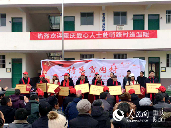 人民网重庆 12月24日电 近日,重庆商务职业学院联合多名爱心企业家和爱心人士赴巫山县曲尺乡哨路村开展为贫困户送温暖活动,送去大量生活物资。捐赠仪式上,村委会为爱心人士颁发了“扶贫爱心企业”的奖牌。