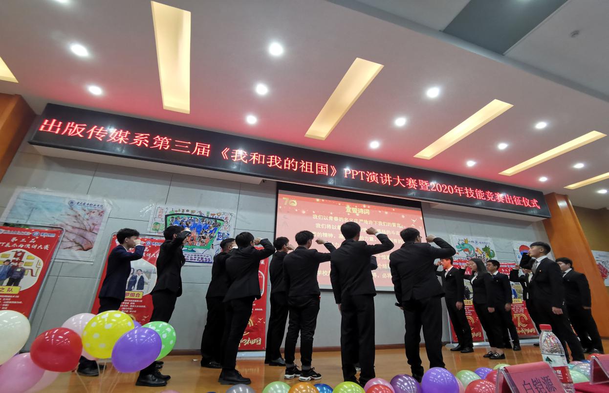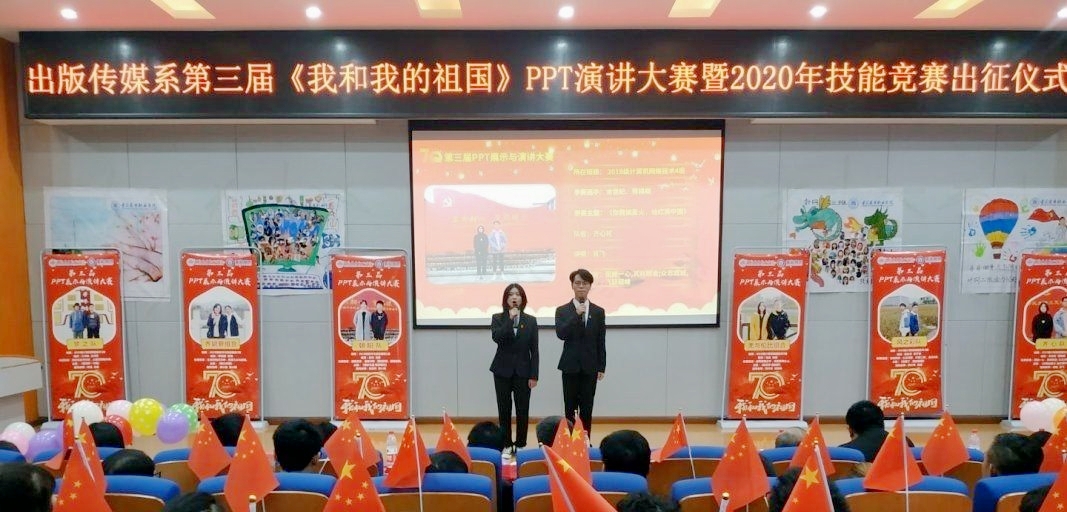 【文/图 出版传媒系】12月17日,出版传媒系美和易思校企共建专业第三届“我和我的祖国”PPT展示与演讲大赛暨2020年技能竞赛出征仪式在学术报告厅举行。院长冉光学,教务处、学工部、出版传媒系相关负责人及300余名师生代表出席活动。