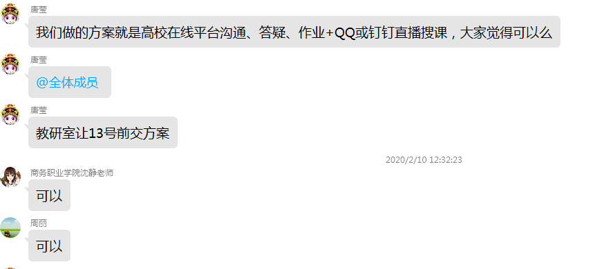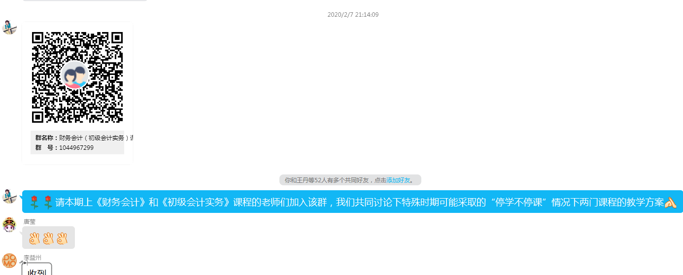 方便交流,创建课程组QQ群。唐莹老师组织大家用腾讯QQ、钉钉等直播平台尝试在线教学,总结经验进行分享;周丽老师作为重庆市级精品在线课程《财务会计》的主持人,在平台上根据老师们各自承担的教学任务创建班级,指导老师们进行班级管理;张帮凤老师主持修订了课程标准,拟定了课程授课计划等教学资料供大家参考使用。