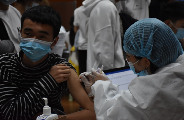 疫苗接种现场设置等候区、登记区、接种区、留观区、应急处置区、物资储存冷链区等功能区,接种流程单向不反复。共设置有24个接种台,24个登记台,84名医护人员和1个驻点医疗保障组,全校大约9000名师生完成第一针疫苗接种。