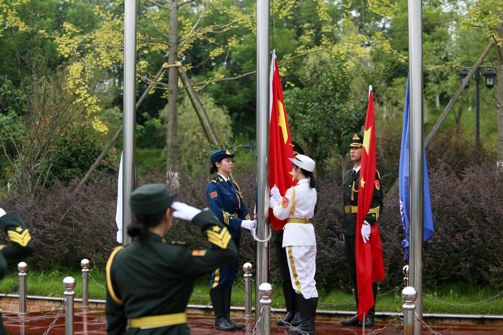 国旗护卫队在威严的国歌声中将鲜艳的国旗缓缓升起,现场师生集体面向国旗,奏唱国歌。