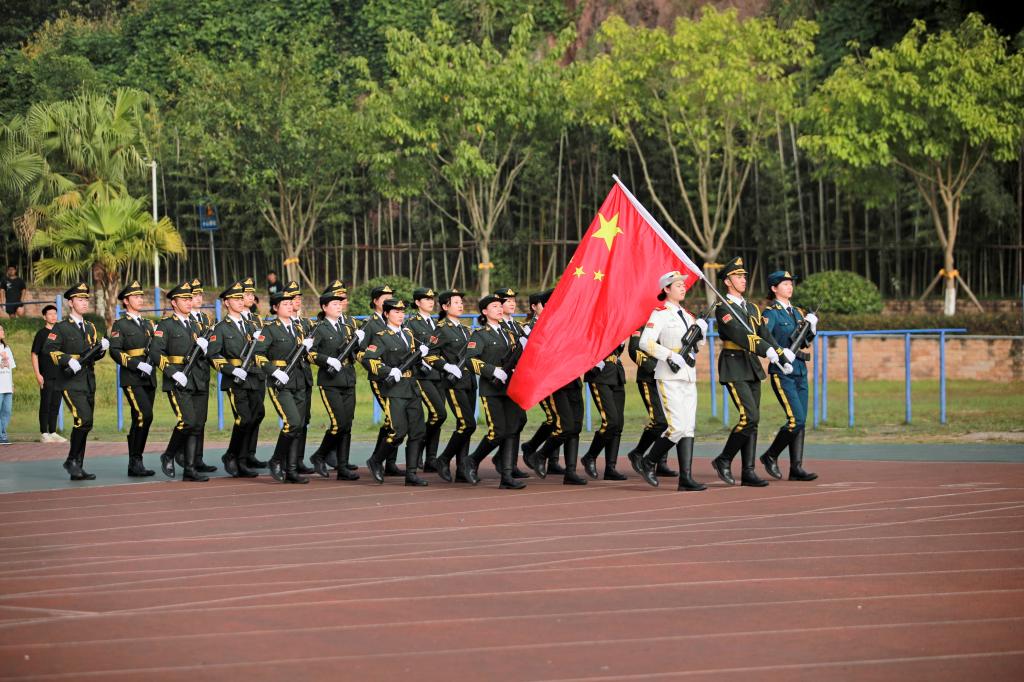 鲜艳的五星红旗随风飘扬,国歌响起,仪式在激昂的《义勇军进行曲》中拉开帷幕,国旗护卫队的旗手们迈着坚定整齐的步伐进入汇报展示现场。