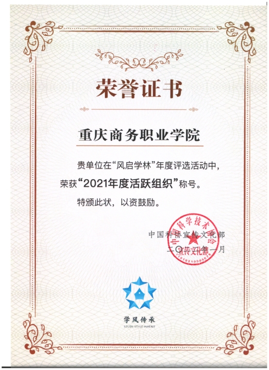 【文/图 电子商务学院】近日,中国科学技术协会(以下简称“中国科协”)授予重庆商务职业学院“风启学林”年度评选活动“2021年度活跃组织”称号。