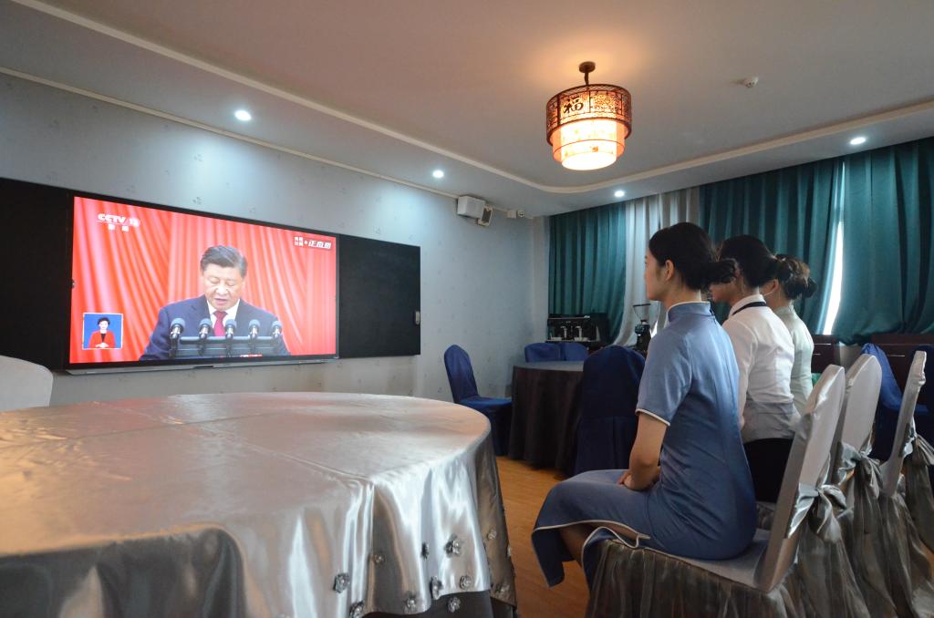 学校通过组织集中收听收看和分散收听收看,实现师生收听收看党的二十大开幕会全覆盖:学校领导、相关职能部门值班人员等30余人集中在第六会议室观看学习,青马班学员50人在第一会议室集中观看学习,学生代表50人、30人分别在北苑一楼、西苑二楼食堂集中观看学习。师生们认真听取习近平总书记铿锵有力的报告,现场不时爆发阵阵热烈的掌声。按照疫情防控要求,除集中收听收看外,学校还通过校园广播广泛播报党的二十大开幕会情况,党群驿站、阅览室、食堂、宿舍、家里……甚至在行进中,都能看到师生们认真收听收看的身影,他们有的凝视思考、有的俯首记录、有的互相讨论,沉浸在学习、思考、领悟、探索的海洋之中。