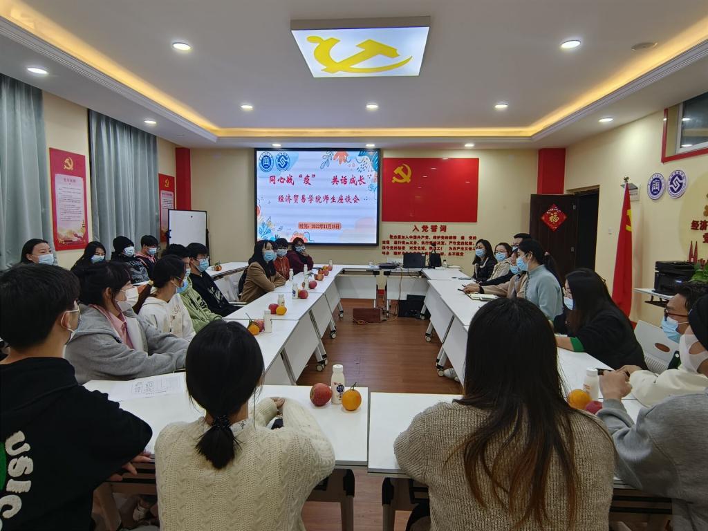 【文/图 经济贸易学院】为了解疫情防控期间学生思想、学习、生活情况,听取学生的合理诉求与意见,及时有效地为学生提供优质的学习和生活环境,11月15日晚,经济贸易学院在1301会议室通过线上线下相结合的方式,召开疫情防控专题师生座谈会,学院党政班子及专任教师、辅导员、行政人员代表参加了本次座谈会。