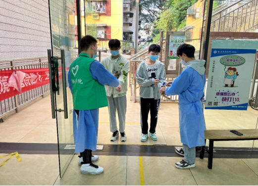 在班级群里,组建志愿者的消息一发出,同学们纷纷响应,“我行”“我来”“我是入党积极分子,我上”,短短的30分钟,一支志愿者队伍组建完成。他们分工明确,按照学校的疫情防控要求,值守在各自的岗位上。负责寝室区域的志愿者们,分散在每一个寝室楼门口,为进出人员测体温并登记,各楼道的志愿者每天为各个寝室更换出入单,对每个寝室出门取餐的两名同学进行登记;负责食堂区域的志愿者们,对进出食堂的人员做好体温检测,引导取餐人群保持安全距离、有序取餐;负责隔离观察室的志愿者们,更是不辞辛劳地在几百步阶梯之间来回冲刺,为健康监测人员配送三餐和物资,满足日常需要;负责核酸检测的志愿者们,不仅协助布置核酸场地、准备核酸检测用品,更是为了不遗漏一人,逐层通知同学们,还在核酸检测进行时,维持现场秩序、细致地登记并核对人数。