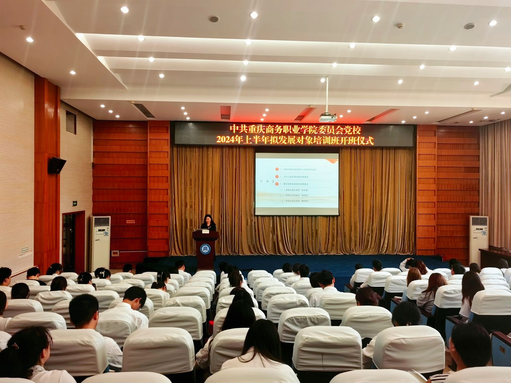 【文/图 组织人事处】为深入学习贯彻习近平新时代中国特色社会主义思想,深入落实习近平总书记视察重庆时的重要讲话和重要指示精神,进一步推动党纪学习教育走深走实,5月15日,学校党委副书记余晓玲在第一会议室以《纪法与青春同行——在党纪学习教育中擦亮青春底色》为主题,为2024上半年拟发展对象培训班的学员讲授了开班第一讲。