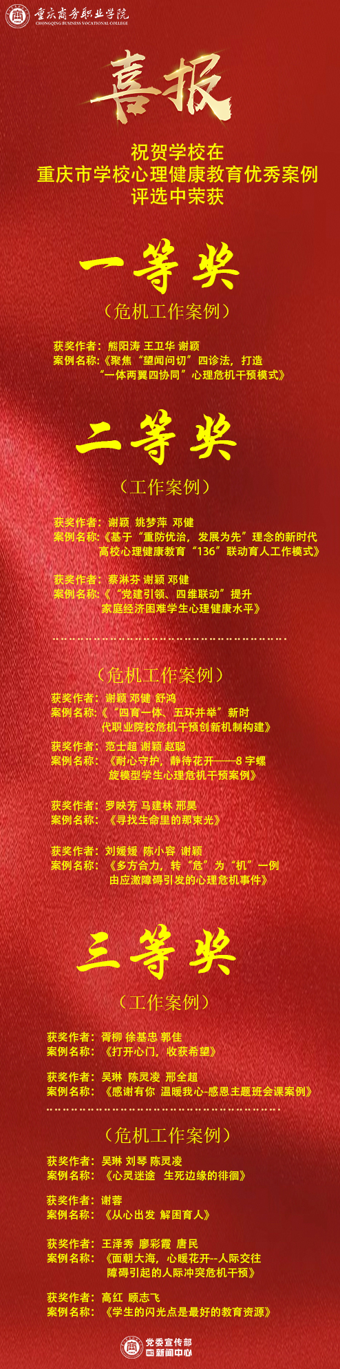 【文/图 党委学生工作部】近日,重庆市教育科学研究院开展的“2024年重庆市学校心理健康教育优秀案例评选活动”结果公布,学校学工队伍提交的高校心理工作案例、心理危机干预案例在此次评选活动中获奖13项,其中一等奖1项,二等奖6项,三等奖6项。