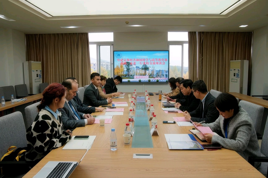 管军对来访一行表示欢迎,并介绍学校办学发展历程、专业设置、校企合作、国际合作交流等情况。哈耶夫·奥尔扎斯作哈萨克斯坦高等教育体系、管理机制、发展动态等介绍,表示希望能深化两国教育合作。托克萨巴·阿拜简要介绍了哈萨克斯坦商业与技术大学,并表达合作意愿。随后,与会各方共同探讨未来合作方向和可行性。