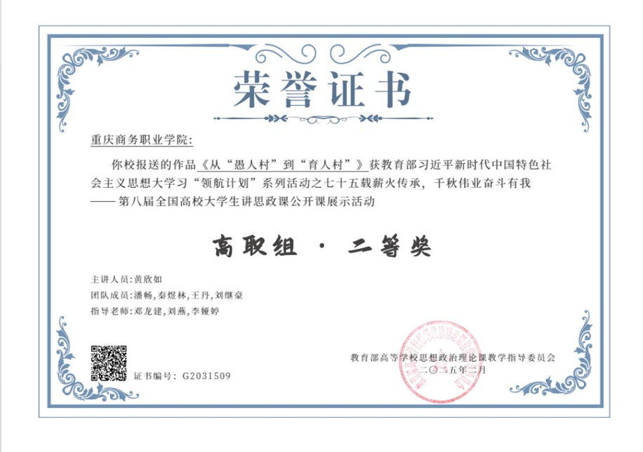 ·据悉,“七十五载薪火传承,千秋伟业奋斗有我”——第八届全国高校大学生讲思政课公开课展示活动共收到1339所高校报送的5007份作品,共评选出获奖作品691项,其中特等奖35项,一等奖106项,二等奖205项,三等奖345项。马克思主义学院教师邓龙建、刘燕、李娅婷指导,电商物流学院黄欣如、人工智能学院秦煜林等参与拍摄的作品《从“愚人村”到“育人村”》荣获二等奖。