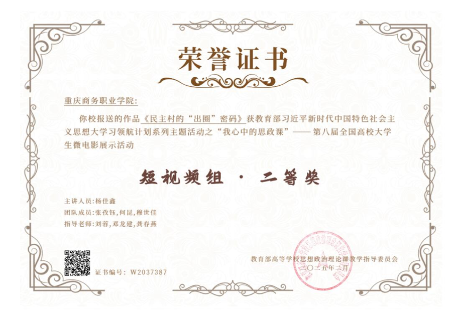 “我心中的思政课”——第八届全国高校大学生微电影展示活动共收到来自1006所高校报送的3134份作品,共评选出获奖作品366项,其中特等奖18项,一等奖52项,二等奖112项,三等奖184项。马克思主义学院教师刘蓉、邓龙建、龚春燕指导,数字传媒学院杨佳鑫主讲、穆世佳等参与拍摄的作品《“民主村”的出圈密码》荣获二等奖。