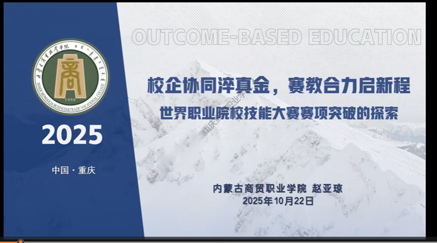随后进行专家分享环节,内蒙古商贸职业学院赵亚琼副教授,以《世界职业院校技能大赛赛项突破的探索》为题,系统阐述了“成果导向教育”理念下的赛教融合路径。她详细介绍了“育‘苗’成‘木’”“破‘壁’筑‘桥’”“聚‘沙’成‘塔’”三大核心策略,即通过社团活动、社会实践和分层梯队机制构建选手培养生态圈;通过“五金”建设路径深化校企融合,以真实项目驱动教学;并通过“专创教师共建一门课”等模式强化跨学科、结构化教师团队建设,为大赛成果的持续产出夯实了根基。