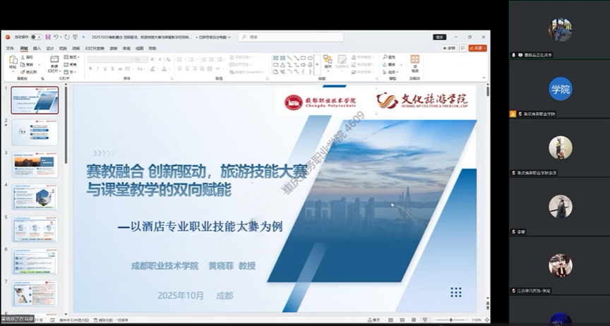 【文/图 文化旅游学院】10月22日下午,中国服务(数字文旅)产教融合共同体秘书处成功举行2025年世界职业技能大赛旅游和餐饮赛道裁判经验分享与“赛教融合”创新实践研讨会的线上虚拟教研活动。本次活动汇聚了来自学界与业界的多位权威专家,吸引了近100名教师、教研人员及行业代表线上参与。