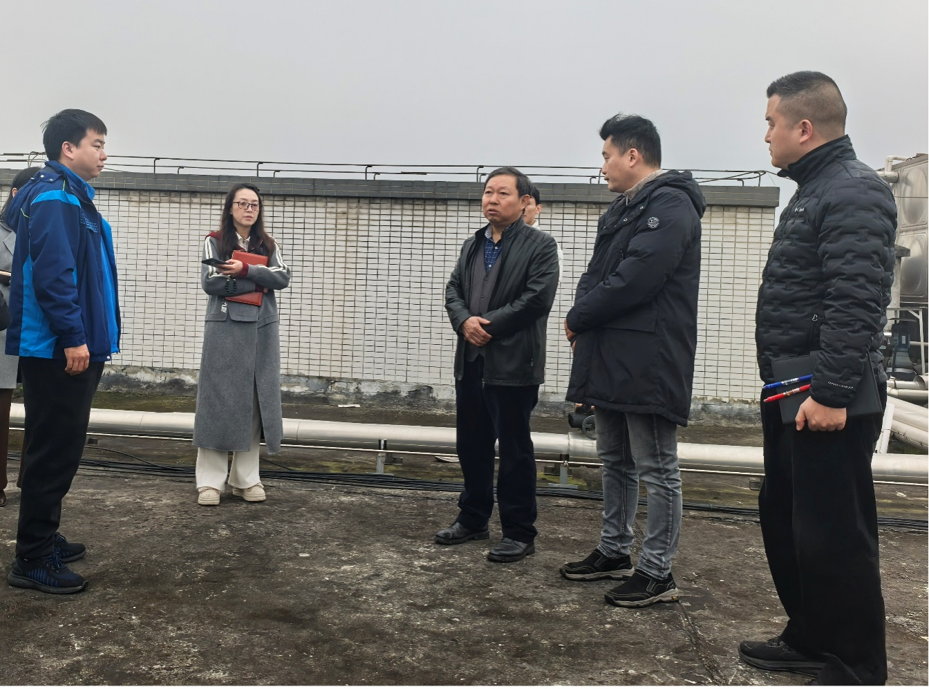 舒鸿一行先后对A、C栋弱电井、宿舍通道、天台等进行了实地查看。检查重点围绕设备运行状态、线路铺设规范、井内环境、周围标识清晰完备以及日常维护管理等方面开展,对可能存在的风险点进行了现场研判。