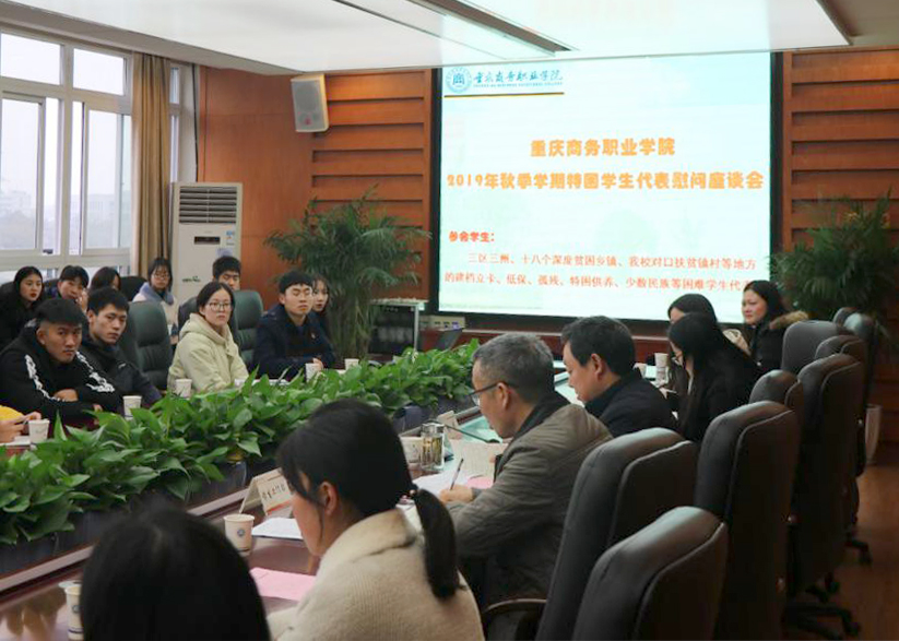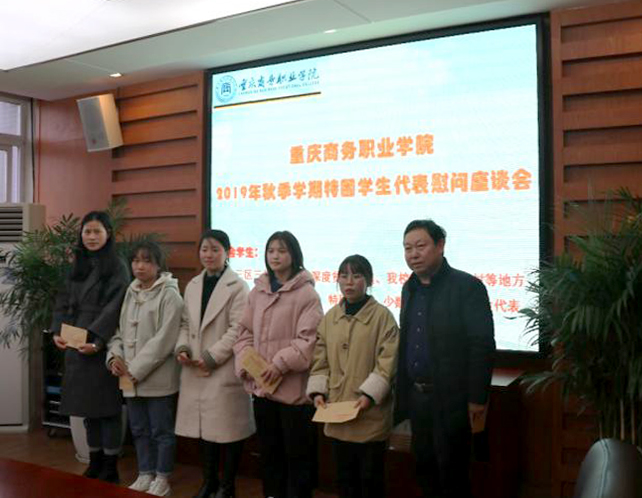 【文/图 学工部】12月25日,学校在第六会议室召开秋季学期特困学生代表慰问座谈会。副院长舒鸿,团委书记,三区三州、十八个深度贫困乡镇、学校对口扶贫镇村等地方的建档立卡、低保、孤残、特困供养、少数民族等困难学生代表参加座谈会。学工部部长主持座谈会。