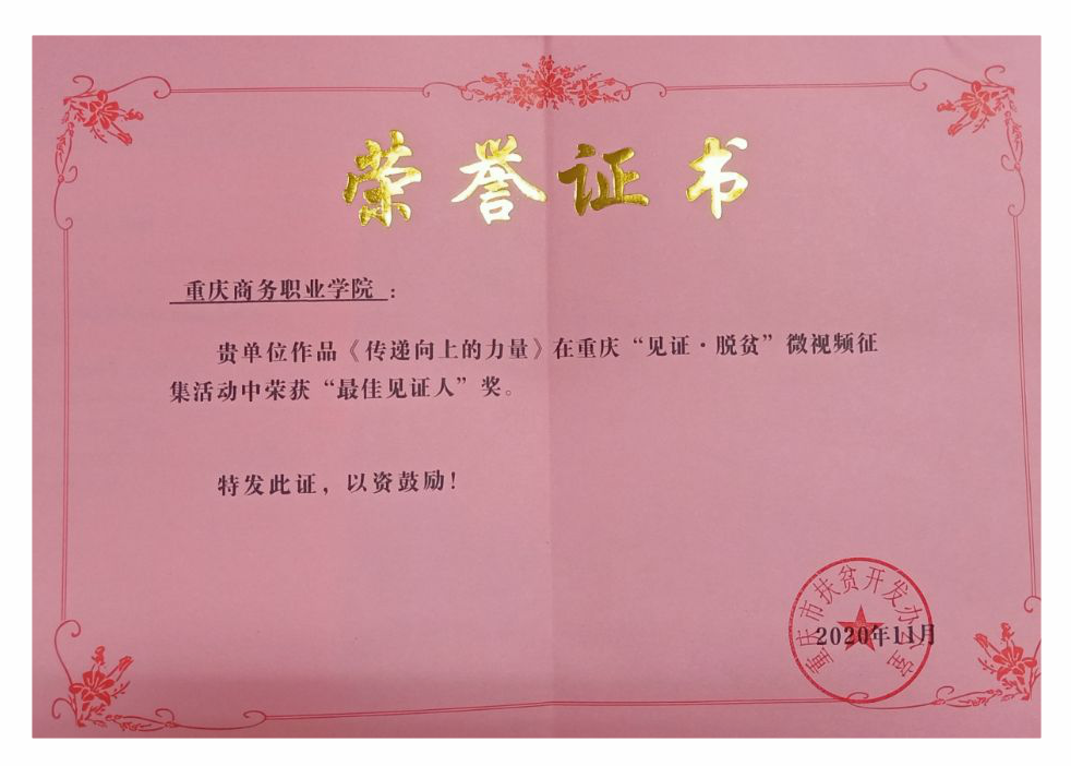 【文/图 学生工作部】在由重庆市扶贫开发办公室主办、新华网股份有限公司重庆分公司承办的“见证•脱贫”微视频征集活动中,在全校师生投票助力下,学校微视频《传递向上的力量》在网络投票环节荣登第二名,并在三轮激烈角逐后荣获“最佳见证人奖”。