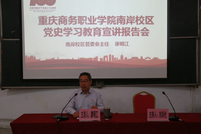 【文/图 南岸校区】5月26日,重庆商务职业学院南岸校区组织开展党史学习教育宣讲活动,校区管委会主任、党史学习教育宣讲团成员廖明江同志作专题宣讲报告。