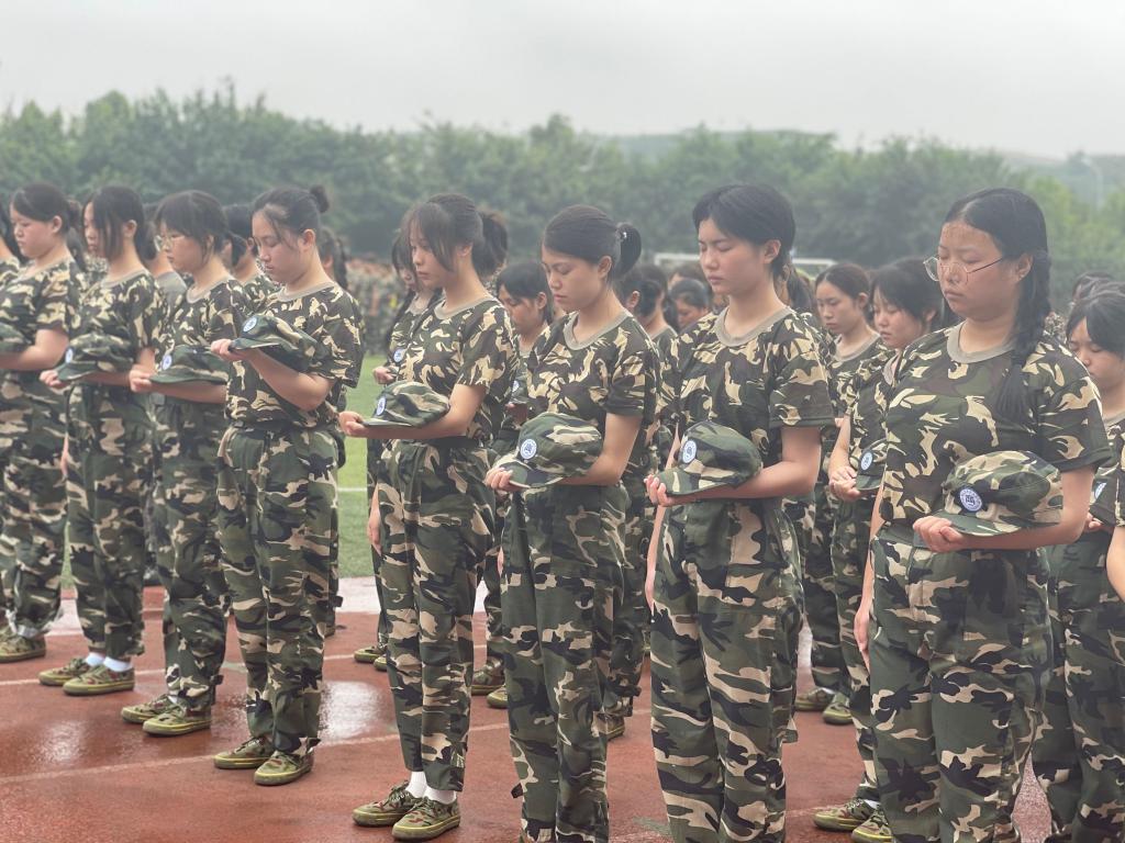2021级全体军训学生列队国旗下,举行升国旗降半旗仪式,并在国旗下集体默哀三分钟,表达对革命先烈们的深刻缅怀和敬仰之情。