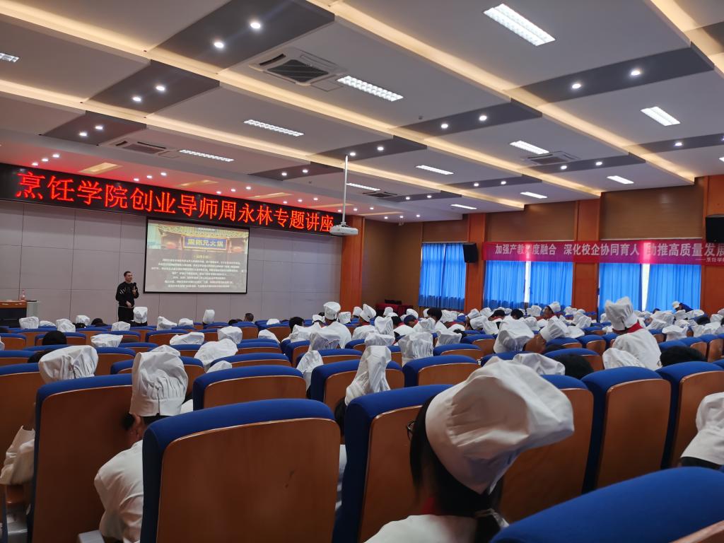 烹饪学院院长与重庆周师兄餐饮文化有限公司企业大学负责人简银安签订校企合作协议,并颁授了实践育人基地牌。贾小波为重庆周师兄餐饮文化有限公司董事长周永林颁发了创业导师聘书,随后周永林为新生带来一场提振职业理想、别开生面的创业专题讲座。