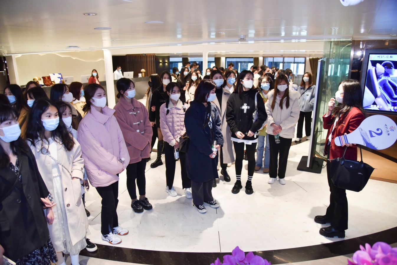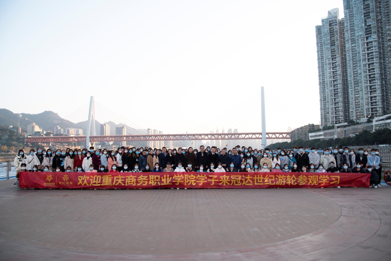 签约仪式前,学校200名学生代表在冠达世纪游轮相关负责人带领下到冠达世纪游轮总部参观、学习、调研,全面了解游轮企业发展历程、企业文化及岗位需求;感受到了学校与重庆冠达世纪游轮有限公司校企共育的“世纪游轮班(酒店管理)”“世纪游轮班(烹饪)”订单班的学习成长优势、福利及奖励政策。