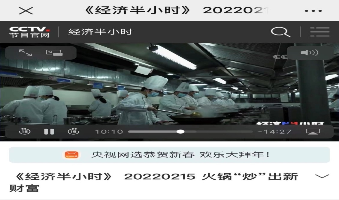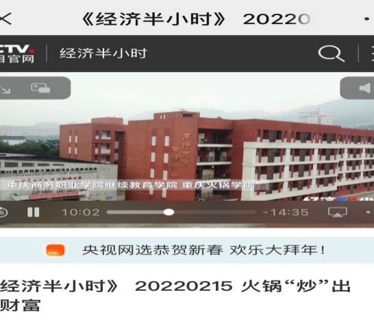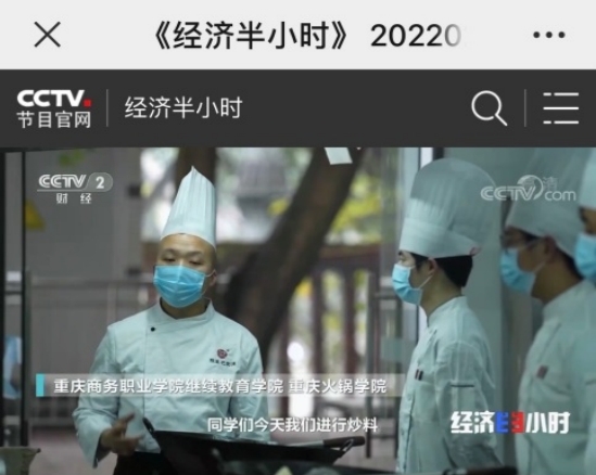【文/图 继续教育学院】2月15日20:00,中央电视台财经频道C C T V《经济半小时》播出节目:火锅炒出新财富。节目报道了我校继续教育学院(重庆火锅学院)学员炒料培训场景。火锅是重庆美食的一张名片,重庆市有3万家火锅店,80万从业人员,行业需求旺盛、发展前景良好。我校火锅学院作为重庆市第一家火锅人才培训的专门机构,2012年以来为社会培养了大量的火锅技能人才和火锅传承人,并将火锅技能人才培训确立为2022年社会服务的重点工作,这不仅有助于推动学校“双高”建设,还有利于推广重庆火锅品牌、促进火锅行业提档升级。此次报道将会有力推动我校继续教育社会培训工作跨越式发展。