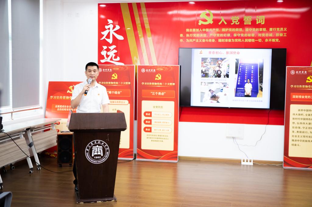 宣讲团成员陈灵凌结合自身对党的二十大精神的学习体会以及以我校优秀毕业生吴艳洁同学为例,为广大同学讲述吴艳洁同学怎么从一名普通同学到走出国门,为国争光,成为世界冠军的事迹,勉励同学们不负时代、不负韶华,立志做有理想、敢担当、能吃苦、肯奋斗的新时代好青年。宣讲团成员、青年教师刘琴以“立德树人守初心,三全育人为使命”为主题,为同学们展示了会计学院践行“三全育人”全过程和取得的阶段性成效,号召广大党员要用心、用力、用情写好会计学院“三全育人”新篇章。宣讲团成员、优秀学生代表袁梦、周思妤和刘笑围绕“崇尚英雄,争做先锋”为主题,叙述了红岩英雄陈然面对敌人的严刑拷打,始终坚守共产党人的崇高信念,没有一丝的动摇的事迹,教育广大学生要发扬光荣传统、传承红色基因,做社会主义核心价值观的坚定信仰者、积极传播者、模范践行者。
