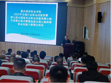 10月27日下午,继续教育学院院长、教授、中式烹调师一级技师蔡顺林为163名参赛选手进行火锅专项技能理论培训,讲授经营管理、烹饪制作、食品营养、安全防范等理论知识;重庆中华食文化研究会秘书长、王文军国家级技能大师工作室负责人、中式烹调师(火锅料理师)二级裁判员郁腾飞进行大赛规则培训,对火锅料理师职业、职业技能大赛组织办法、实操比赛(考评标准说明)等内容进行了深入讲解;“陆派火锅”开创者、巴倒烫火锅创始人、重庆火锅学院首席客座教授王文军就大赛说明会、评分标准和评分软件对仲裁组和裁判组成员进行了培训。