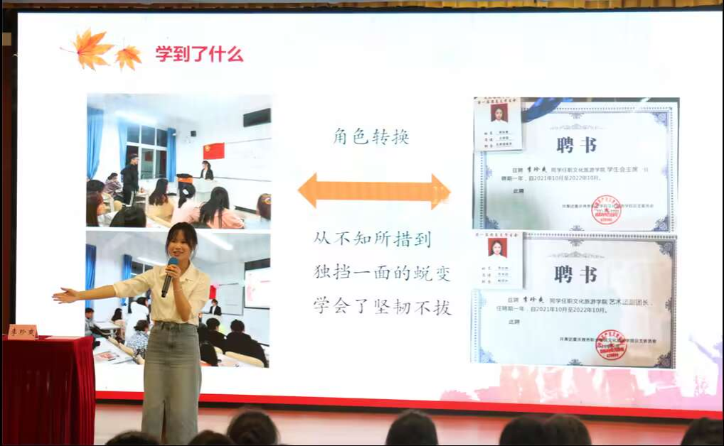 本次培训由学院团总支书记罗映芳老师担任主讲人,围绕“我为什么要当团干”的主题,从“什么是团员骨干”“团员骨干要做什么”“如何当好团员骨干”和“我要成为什么样的团员骨干”四部分进行。罗映芳深入浅出地阐述了团员骨干的真实含义,明确了团员骨干的基本职责,用“干”“练”“用”规划了学生团员骨干大学三年的核心目标,激励全体团员骨干在思想上准备、心理上认同和行为上执行。最后用6个典型人物的故事诠释了青春榜样的力量,勉励全体同学端正态度、调整行为、培养习惯、养成性格,最后改变命运。在培训会后,团总支特别邀请到了优秀学姐李珍爽(原2020级酒店管理专业毕业生,文化旅游学院第一届学生会主席团成员,现专升本就读重庆师范大学)给大家做经验交流。在学姐的三年大学历程中,同学们见证了一个挺拔、坚韧的学生团干成长历史,无数个第一次的挑战和蜕变,塑造了如今舞台上闪闪发光的优秀学姐,这些分享都激励着在场每一位同学,激发了全体团员骨干奋发向上和顽强拼搏的精神力量。