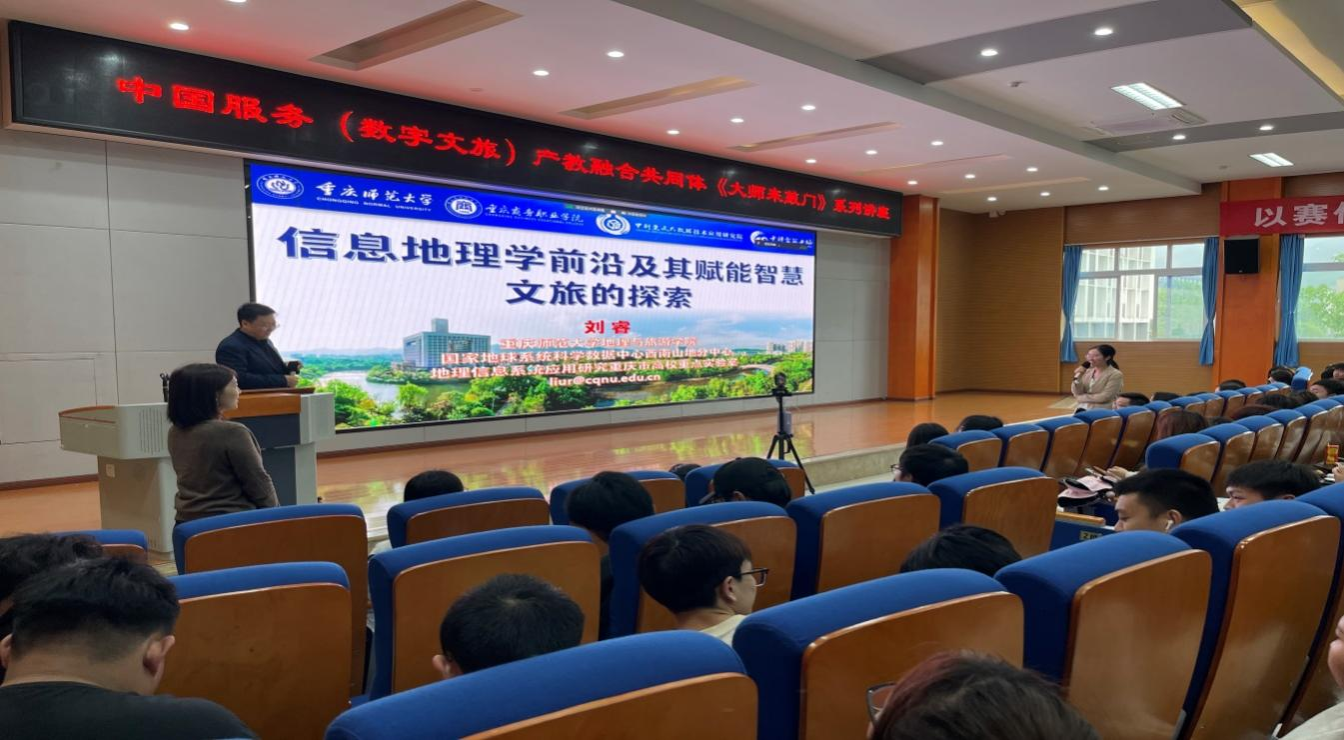 【文/图 文化旅游学院】4月24日下午,由中科重庆大数据技术应用研究院支持,中国服务(数字文旅)产教融合共同体倾力打造的2024《大师来敲门》行业公益性讲座顺利启动。重庆师范大学地理与旅游学院副院长刘睿教授应邀做客,并围绕《信息地理学前沿及其赋能文旅业高质量发展的路径探索》进行学术讲座。本次讲座在第二学术报告厅举行,并在腾讯会议及中科智汇工场进行直播,近300余名师生参与线下讲座,共同体成员近200人参与线上讲座。