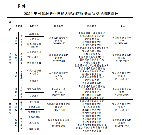 【文/图 文化旅游学院】4月29日下午,2024年国际服务业技能大赛酒店服务赛项的编制规程说明工作会以腾讯会议的形式举办,本次会议由中国商业联合会主办,中国服务(数字文旅)产教融合共同体牵头承办。各赛项牵头单位郑州旅游职业学院、山西旅游职业学院、重庆师范大学、无锡城市职业技术学院、山西省财政税务专科学校以及重庆渝州宾馆等25家参与单位共45人参与会议,会议由中国服务(数字文旅)产教融合共同体秘书处负责人赵晓芳主持。