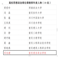 我校获评2个类别的奖项。其中,马克思主义学院党总支书记、院长邓龙建入选“高校思想政治理论课教师年度人物”名单,党总支副书记、副院长刘蓉入选“思政课教师择优资助”名单。