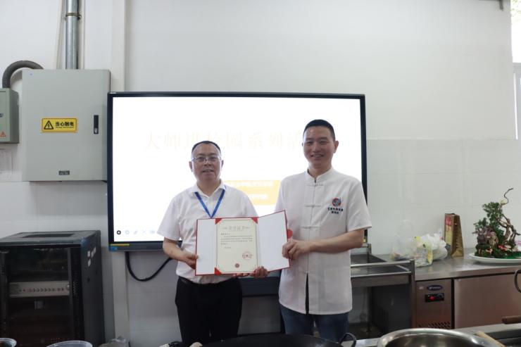 第三期活动特邀重庆世纪金源大饭店行政总厨黄荣胜大师为烹饪学院师生、美食研学社同学授课。烹饪学院、继续教育学院、渝菜烹饪研究院院长蔡顺林教授出席本次授课活动,并为黄荣胜大师颁发授课荣誉证书和荣誉牌。黄荣胜讲解了意境菜的概念、历史起源、发展现状及未来行业市场趋势,并现场演示制作其创作的“一菜一诗一画一故事”意境菜“江山固本幸福鲍(抱)”