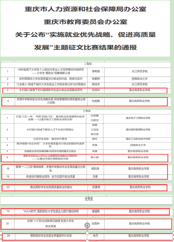 【文/图 招生就业处】近日,重庆市人力资源和社会保障局办公室、重庆市教育委员会办公室联合发布了“实施就业优先战略、促进高质量发展”主题征文比赛结果,学校教师在此次征文比赛中,获二等奖2项、三等奖4项、优秀奖3项。