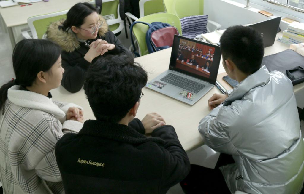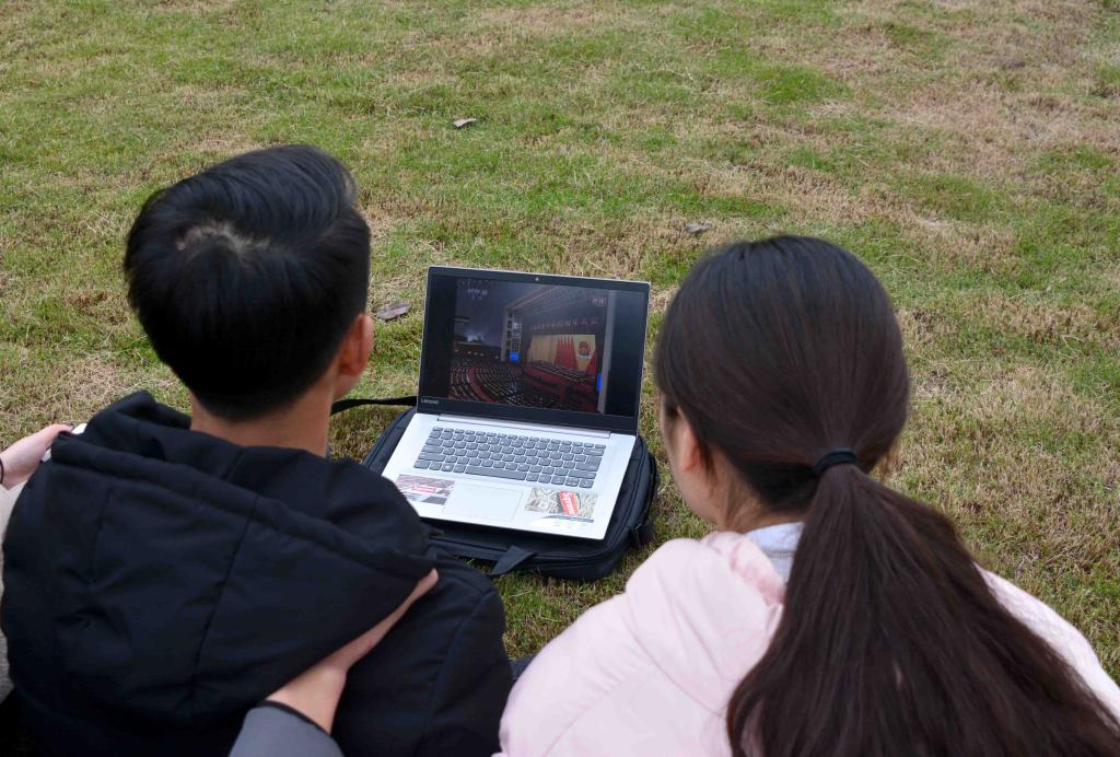 机关党员、教职工,各院系党员、教职工和团学干部代表在办公楼第一会议室集中观看;有课的班级由任课老师组织在课堂上集中观看;无课的同学在寝室、图书馆、北山公园通过电脑、手机、iPad收看。