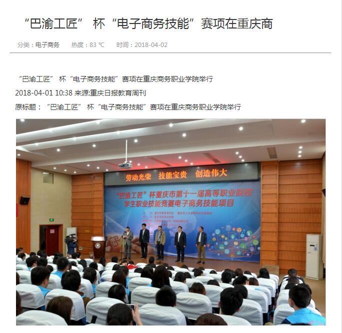 沙坪坝手机台:巴渝工匠杯重庆市第十一届高等职业院校学生技能竞赛电子商务技能赛项在我区举行。http://sj.shapingba.cbg.cn/2018/04/03/28228049.shtml。