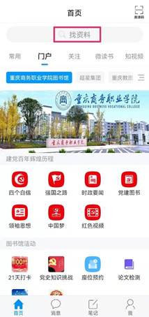 首页上方“查资料”可通过关键字检索,获取电子书、期刊、论文等电子资源。