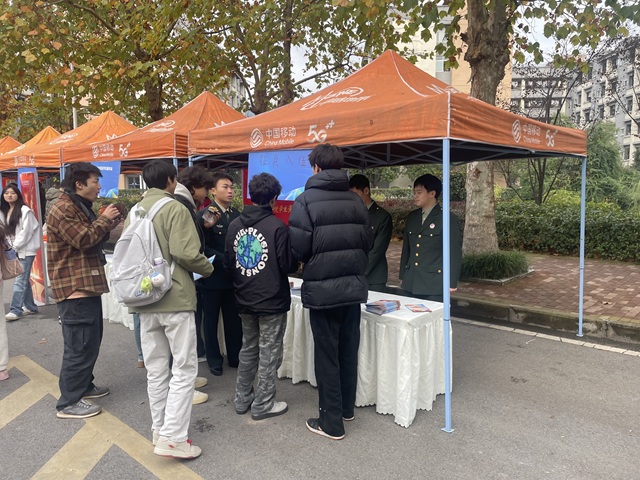 征兵宣传点前,校武装部老师和退役大学生发放征兵宣传手册。他们结合自身经历,详细介绍征兵政策、入伍流程、优待待遇等内容,耐心解答同学们提出的关于体检要求、军人职业发展、退伍安置等方面的问题。