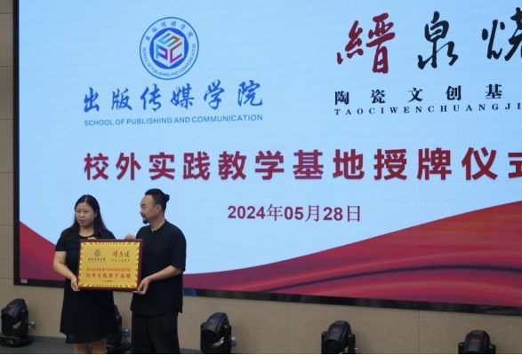 5月28日,学院与缙泉烧陶瓷文创基地在3104创意影视工坊举行校外实践教学基地授牌仪式。缙泉烧陶瓷文创基地创始人陈勇,出版传媒学院党总支书记、院长廖彩霞及师生代表参加仪式。