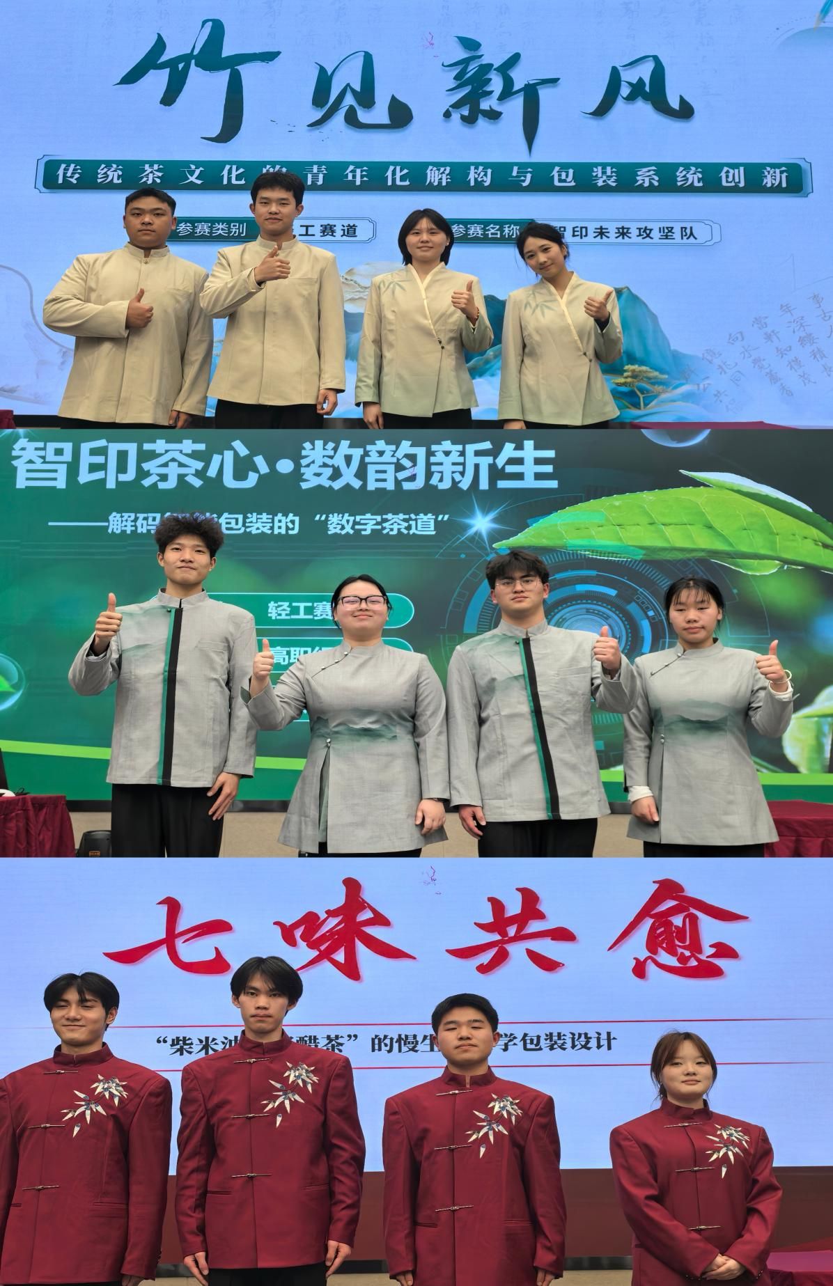 此次大赛中,学院参赛项目涵盖轻工、数字艺术、新闻传播非遗等四大核心赛道,各项目紧扣时代脉搏,融合文化传承与数字创新,展现了极高的专业水准。轻工赛道上,参赛队伍深耕传统文化与现代设计的融合,以“竹韵茶礼”“数字茶道”“慢生活美学包装”等特色项目,凭借独特的创意、精湛的工艺和实用的价值,分别斩获金奖、银奖;数字艺术赛道的两支队伍表现亮眼,《阿贝贝的拥抱》—— 自闭症儿童智能疗愈玩具创想项目,以温暖的主题和创新的科技构想打动评委,三星堆数字文化传承项目则凭借对传统文化的数字化创新演绎,双双荣获银奖;新闻传播赛道的队伍聚焦地域文化传播与博物馆数字化推广,通过多元传播手段与创新内容呈现,分别拿下银奖与铜奖,非遗赛道将非遗传承展现淋淋尽致获得银奖。