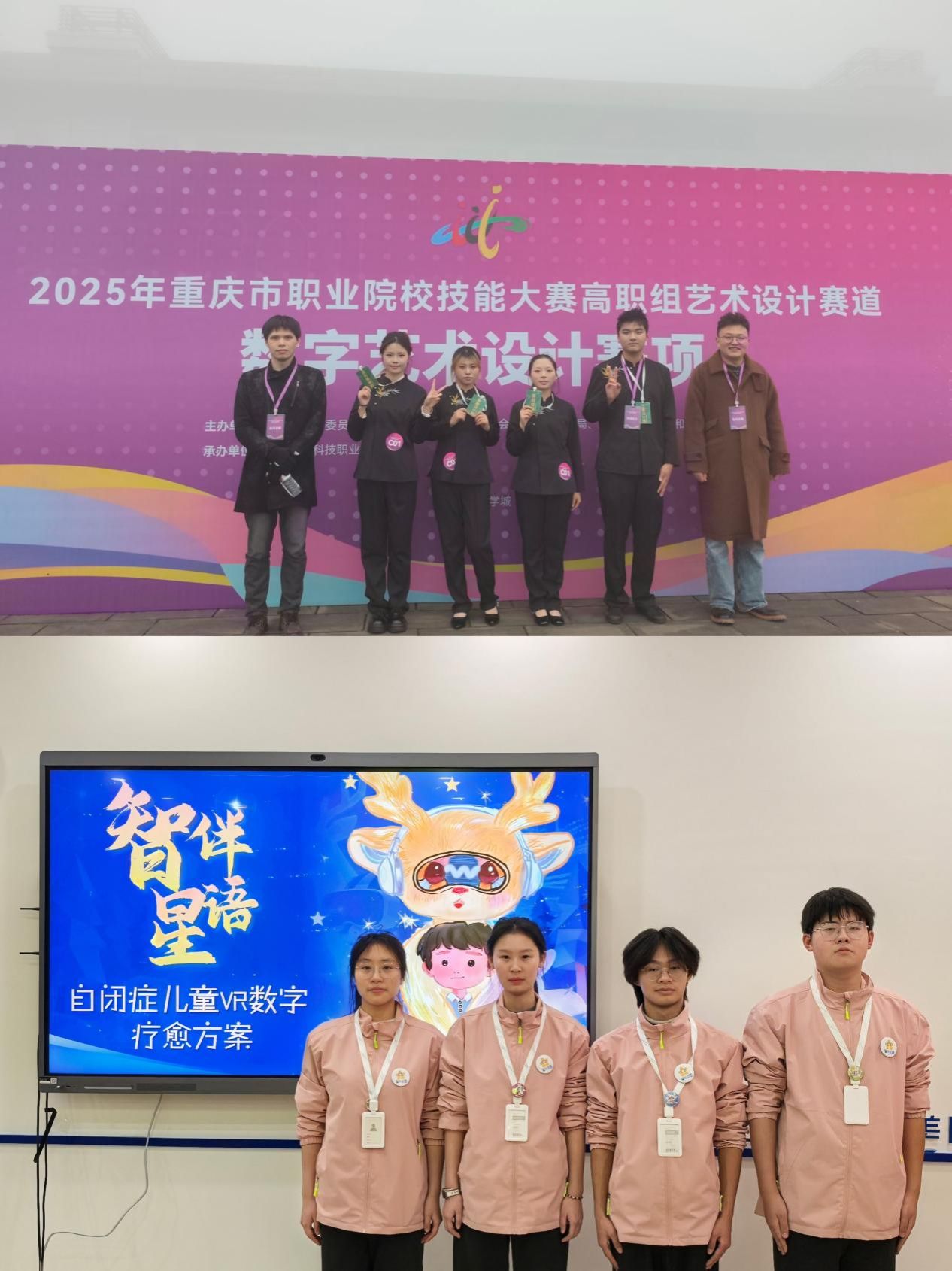 近日,2025 年重庆市职业院校技能大赛火热开赛。在学校党委行政的坚强领导下,在教务处的悉心指导及各部门的鼎力支持下,数字传媒学院师生凝心聚力、奋勇拼搏,历经 1 个月的艰苦备赛与激烈角逐,凭借扎实的专业功底、创新的设计理念和默契的团队协作,在四个赛道崭露头角,最终组建的10支参赛队伍不负众望,斩获1金5银2铜的优异成绩,彰显了学院高技能人才培养的扎实成效。