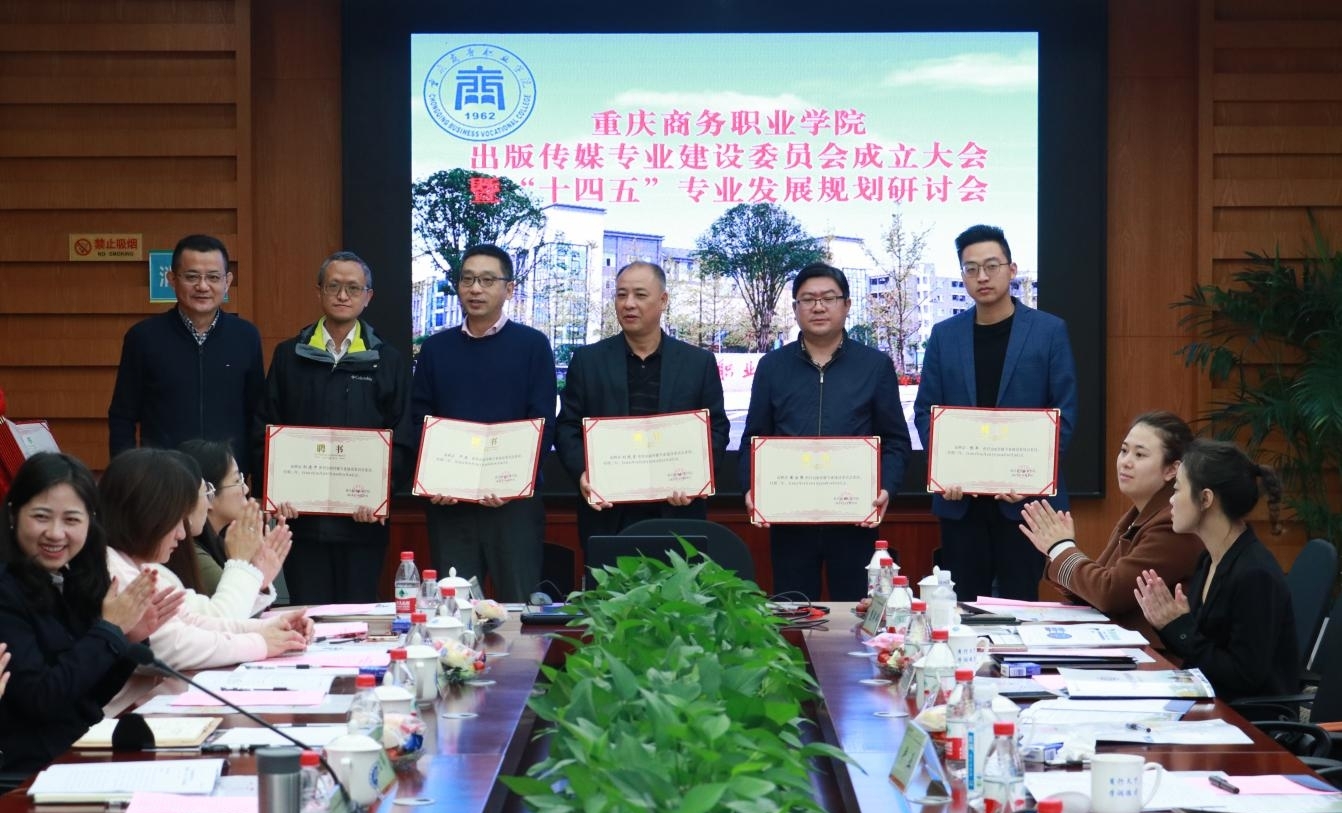 10月29日上午,出版传媒专业建设委员会成立大会暨“十四五”专业发展规划研讨会在学校第三会议室举行。会议邀请四川外国语大学新闻传播学院邬建中、重庆第二师范学院文学与传媒学院副院长严亚、重庆电子工程职业学院数字媒体学院院长刘晓东、重庆工程职业学院艺术设计工程学院院长黄治国、重庆轻工职业学院教务处处长樊可义、重庆市印刷协会会长吴虹、印通天下印刷科技有限公司董事长张宏波、重庆市远大印务有限公司董事长张爽、凤凰数媒(北京)教育科技有限公司副总裁毛超、华龙网产教合作中心事业部总经理彭发清等院校及企业领导参加研讨会。学校副院长贾小波,质量管理处,出版传媒学院副科级以上干部、教研室主任及各专业负责人参加会议。
